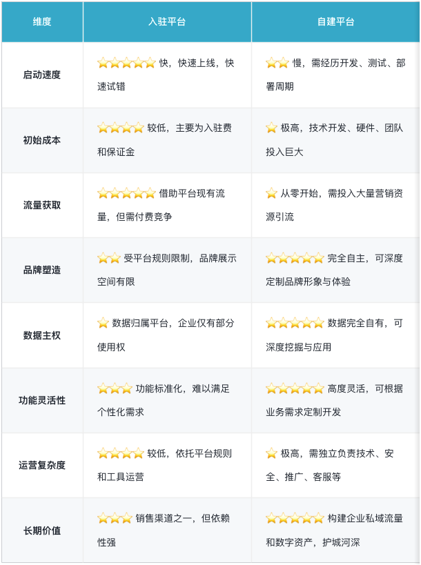 ● 自建平台是“造船远航”,用自己的力量,构建专属航线,适合深耕和远征。