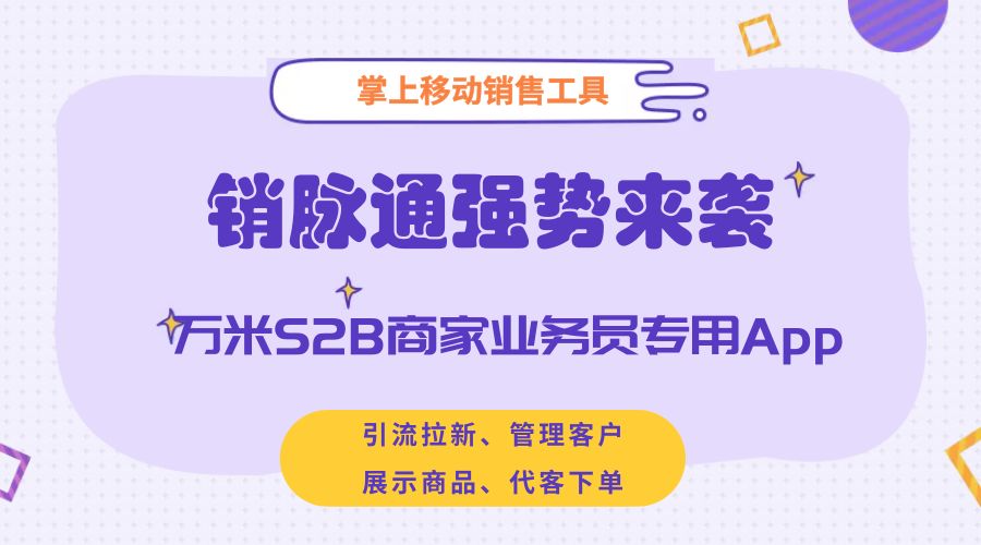 同时,万米S2B产业电商平台的各项功能也在不断地更新和迭代。那么,今天主要给大家介绍的是:新近上线的商家业务员专用App——销脉通,该APP直接无缝对接万米S2B产业电商平台,交易、库存、数据一体化管理。下面大家和万小米一起来系统了解下“销脉通”到底是一款怎样的神器,又能给业务员拓客带来哪些改变呢?