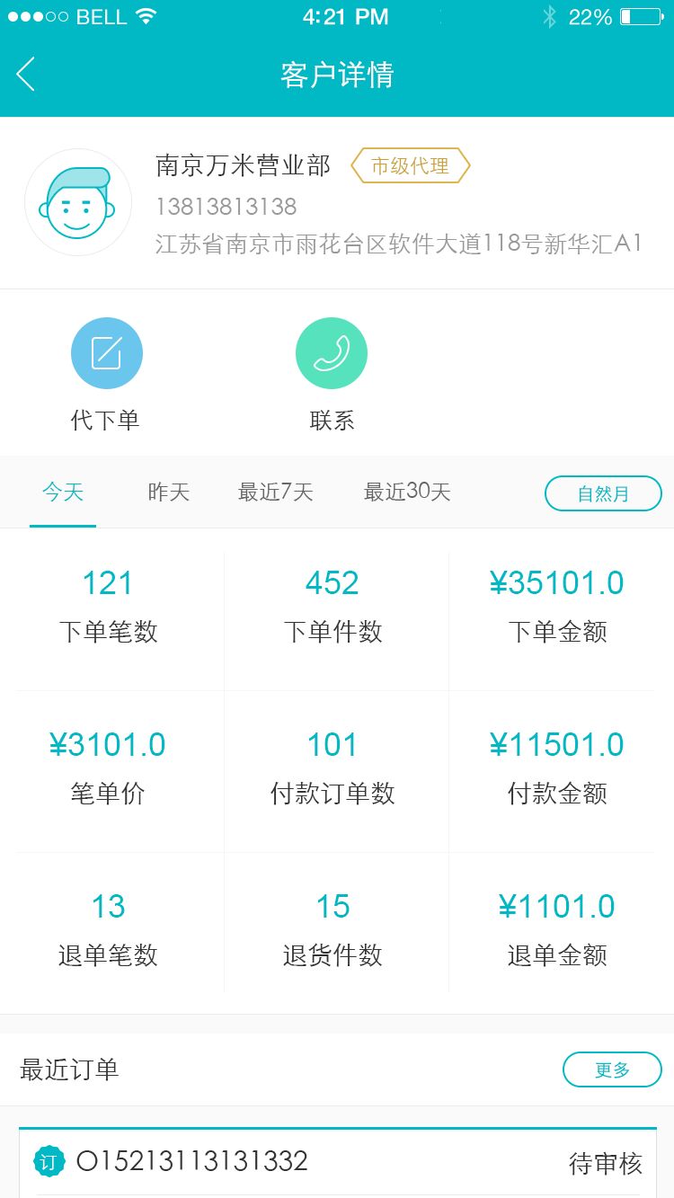客户主页有详细的客户信息和下单动态的留存, 下单笔数、笔单价等各项客户数据一目了然,智能商业分析帮助业务员更好地管理自己的客户。