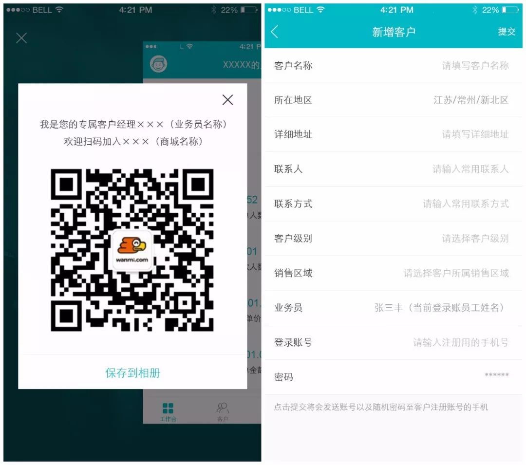 可面对面邀请扫码,社交分享邀请码,当客户注册时则可自动与该业务员关联;