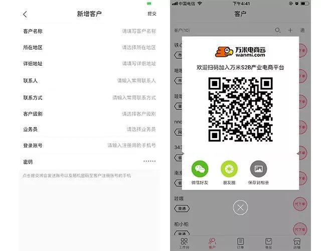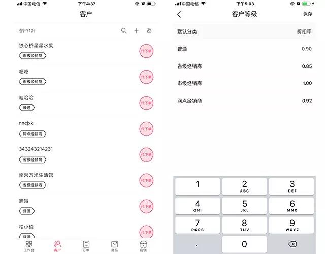 4、客户管理也十分方便,商家可随时调整客户等级,保障客户可及时享受到最新的优惠政策,帮助商家更好的维护客户、推进业务;此外还可实现随时随地代客下单,轻松解决了客户纸质订单、电话下单、在外谈生意时临时下单等多个业务场景的问题,可避免错单、漏单,全面提升了业务效率。