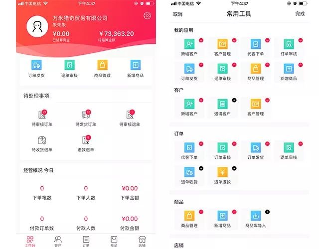 2、个性化的工作台提高了商家的经营效率,所有代办事项都会有提示,操作简单、处理方便;尤其是店铺每日的经营数据,都会实时呈现,让商家对店铺的日经营情况“了然于胸”;此外商家的员工还可自行配制自己的常用工具,对于员工没有权限看到的部分则会自动隐藏,方便灵活、安全可靠。