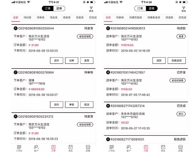 5、订/退单管理智能高效,手机端即可处理,及时审核发货,牢牢把握商机,分分钟审核退款,客户体验感更好。
