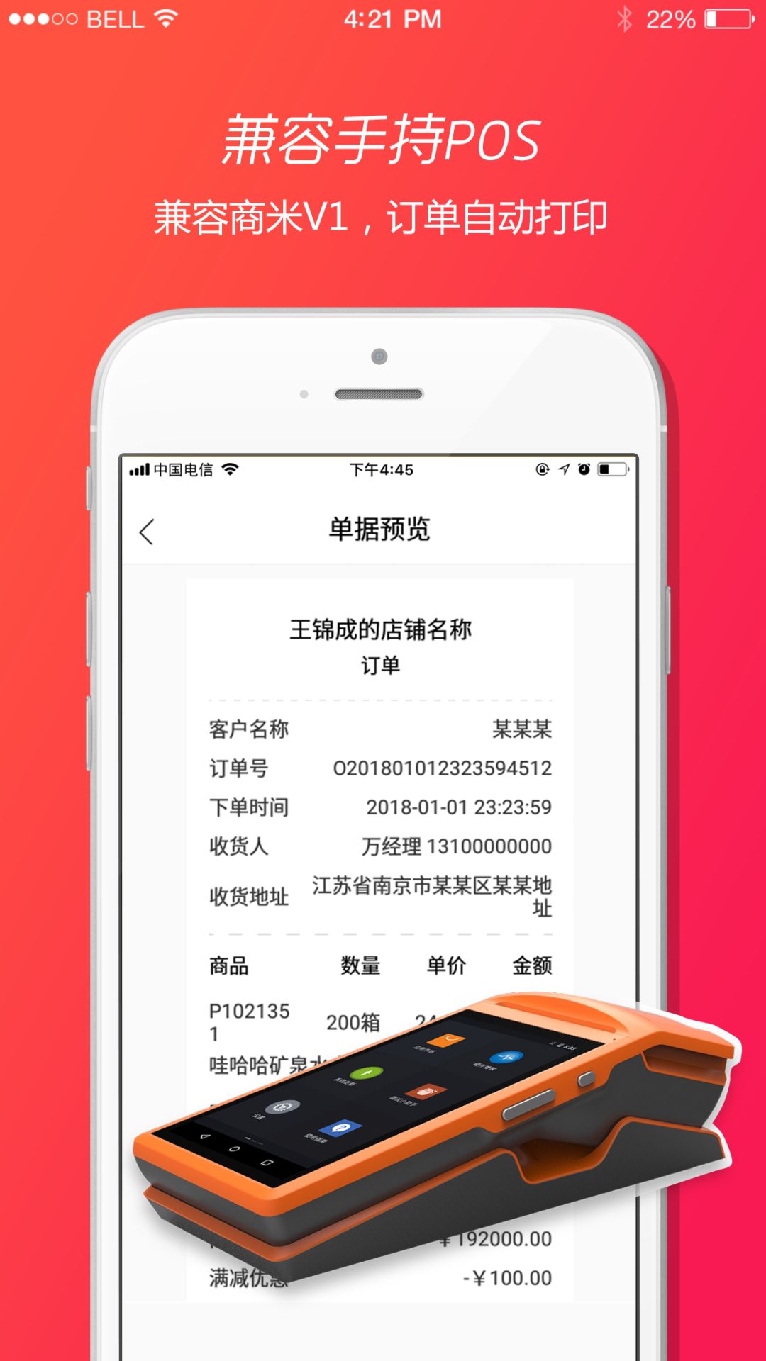 6、最后不得不说的一个优点,那就是云掌柜可完美兼容手持POS机,门店和网店可直接共用一台设备;支持订单打印、发货单打印、还支持自定义打印模板,很酷吧?
