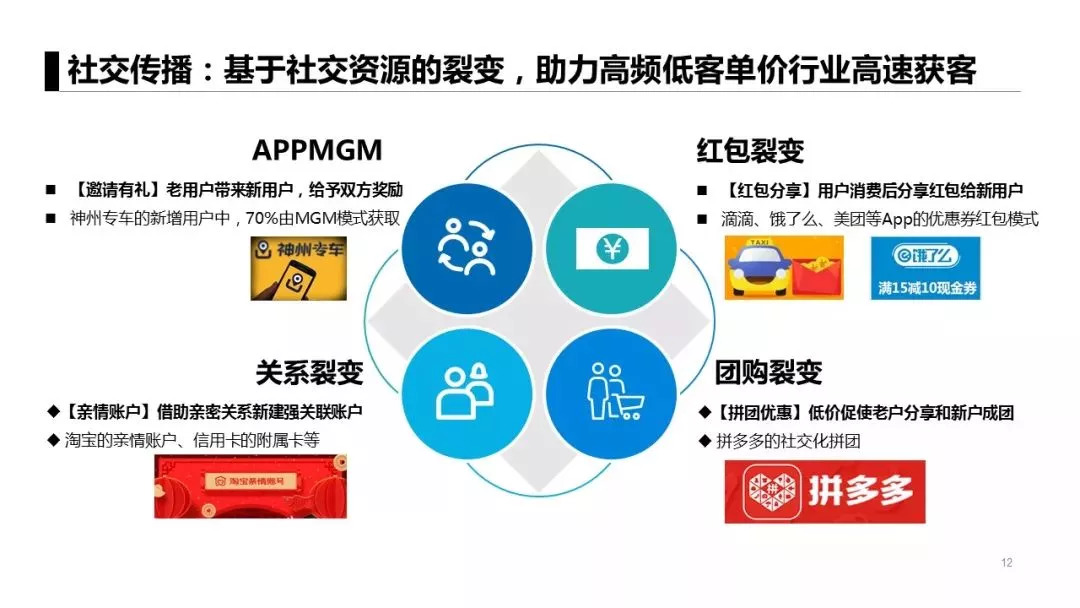 这种APP的获客模式,有时可以小宇宙爆发大能量,常常因为一个有趣的创意或者福利活动而刷爆朋友圈。这也是一种从点到面的推广模式,这种社交传播模式的玩法可以分为APPMGM(老带新)、红包裂变、关系裂变和团购裂变等。