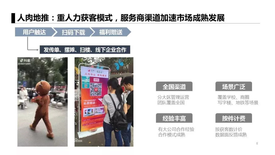 这种获客模式很重,也就是早些年北京望京的扫码一条街的来源。在人流密集的地方设置一个展位,放些礼品,拿上宣传单就可以获客啦。针对不同的受众对象也可以使用不同的话术,抖音火了之后,也有穿着cos的服饰发传单的,从而使整个宣传过程更加惹人注目、更加有趣。