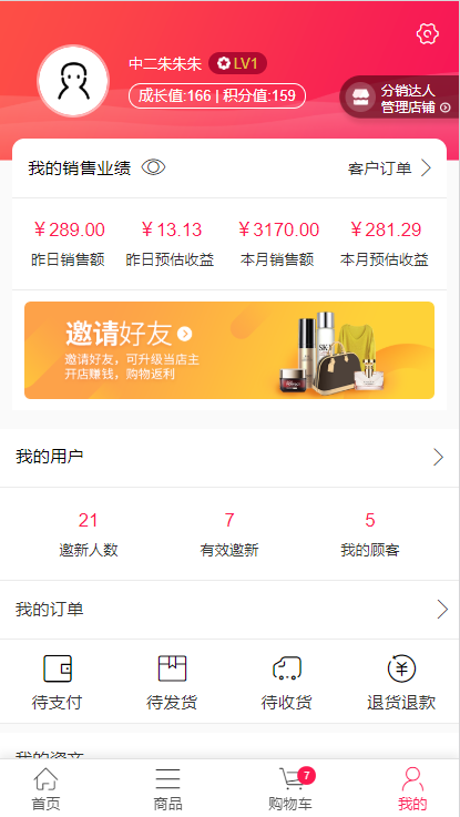 分销员可在个人中心查看自己的销售业绩、邀新数量,以及自己的订单、自己客户的订单、资产等信息,实时了解自己的业绩情况。