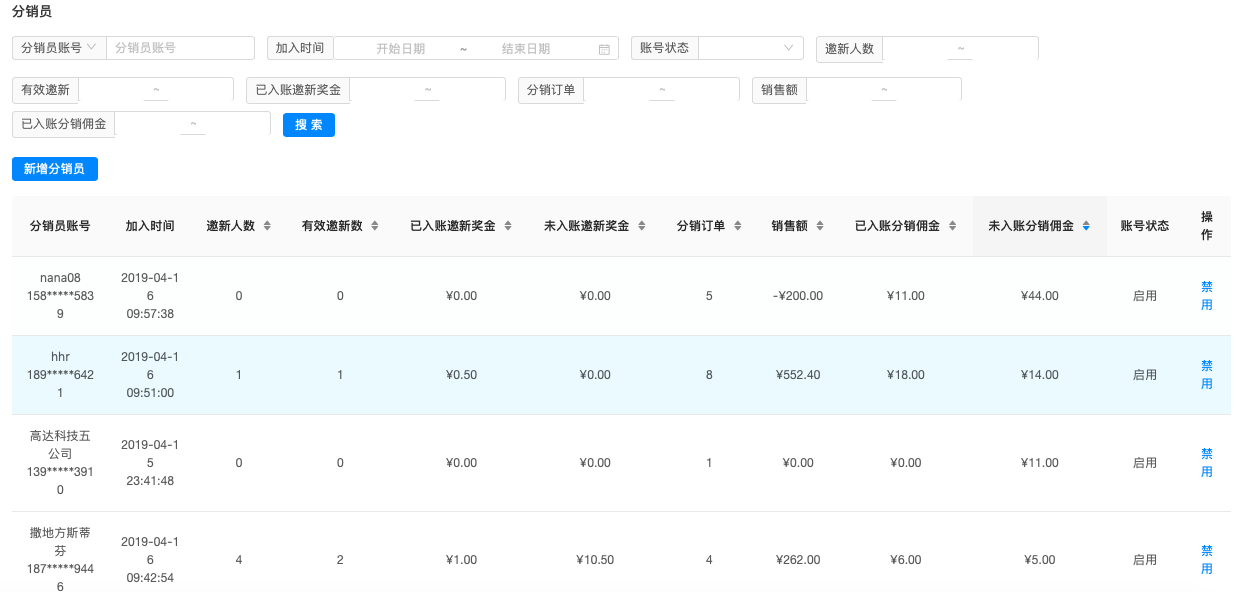 平台方可通过多种维度查看并管理分销员,也可禁用分销员的分销权利。