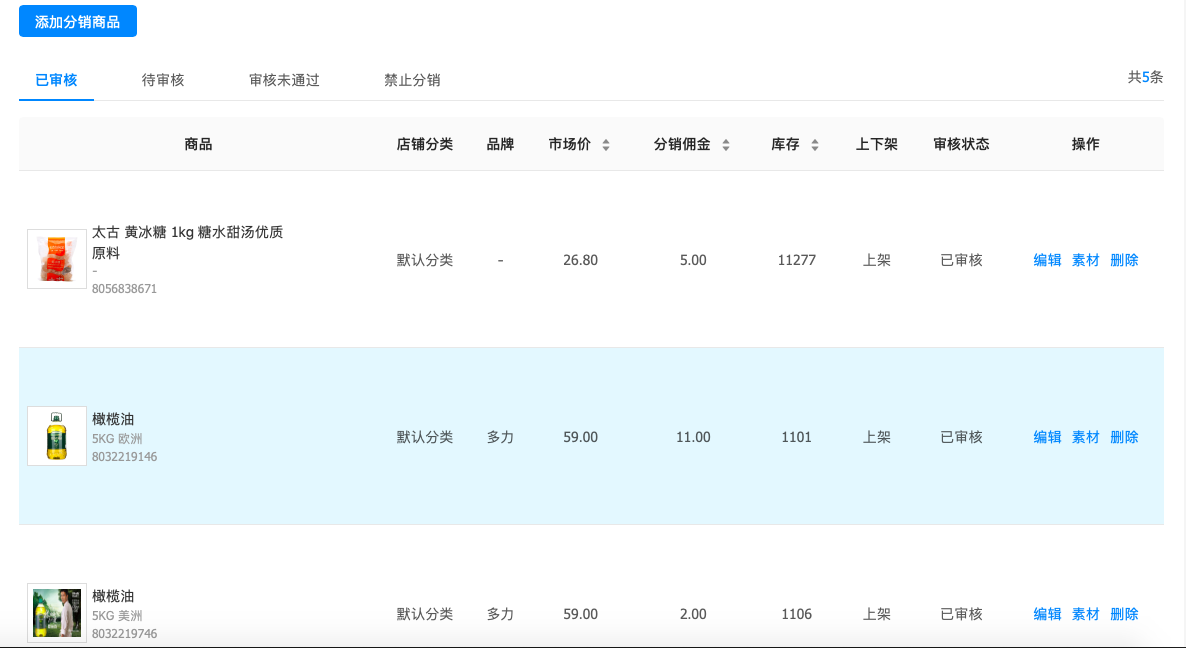 分销商品是由商家进行上传,平台方进行审核,并配置统一的推广素材,素材包括图片、视频、推荐文案等。