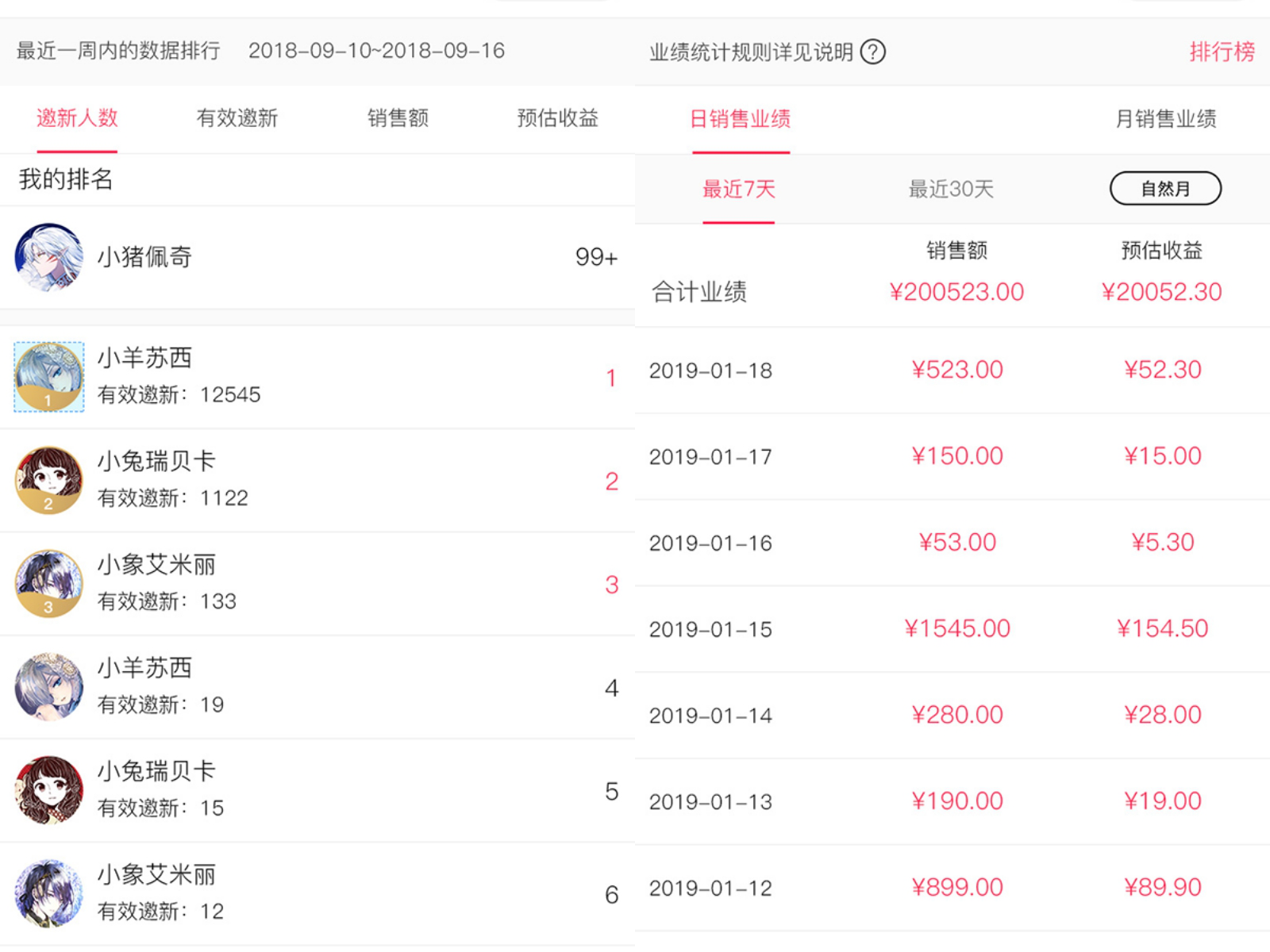 分销员点击销售业绩,可按日/月查看自己的销售业绩,也可以通过排行榜了解自己在分销员中的业绩排名。排行榜包含销售额、预估收益、邀新人数、有效邀请的排名。
