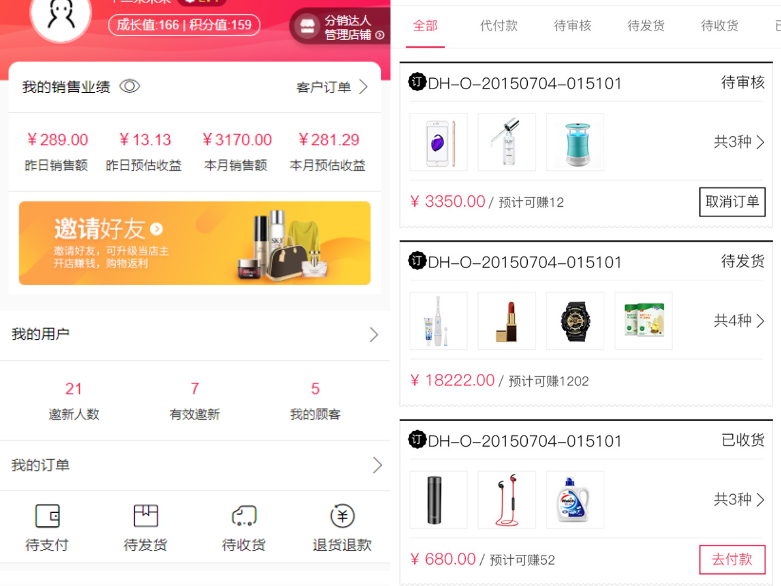 平台的任何会员都可以申请成为分销员。成为分销员后,个人首页除了新增分销员的销售业绩、自己的客户以及客户订单等外,还新增“管理店铺”的入口。