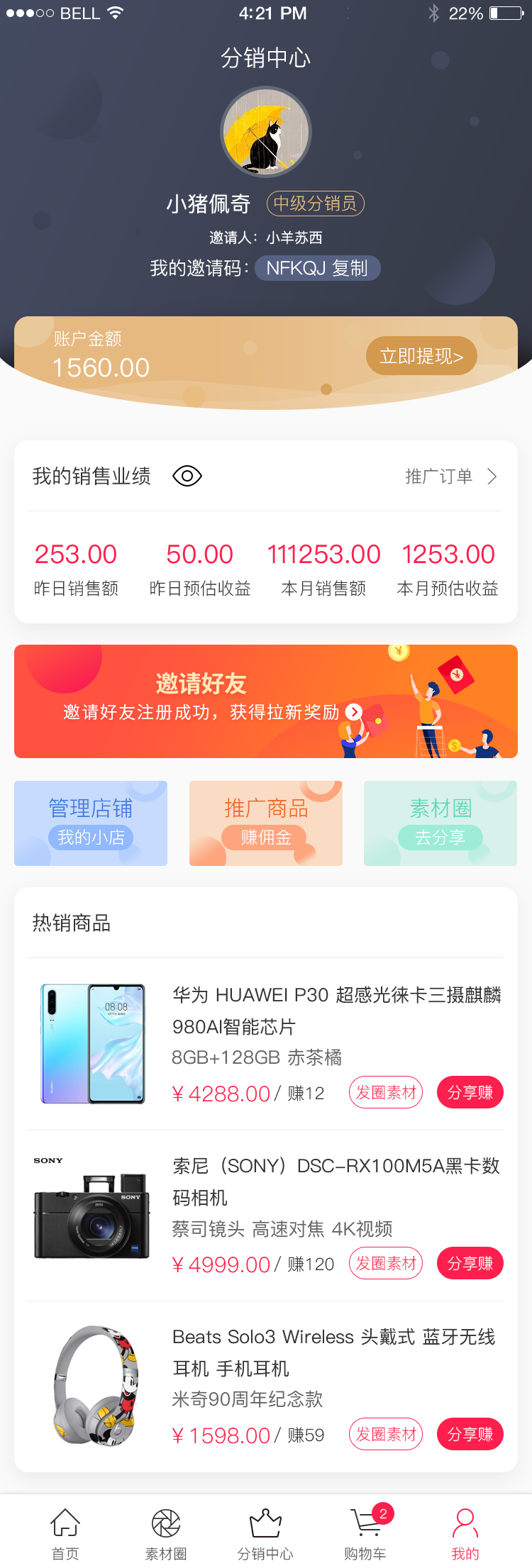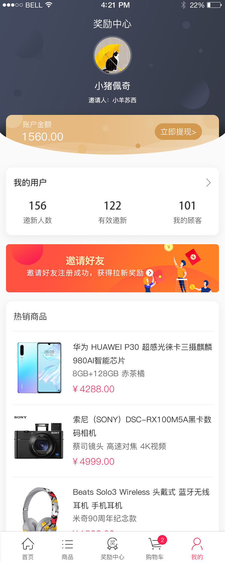 我的用户:可以看到邀新人数、有效邀新、我的顾客等详细数据,以及下方还有热销商品的推荐。
