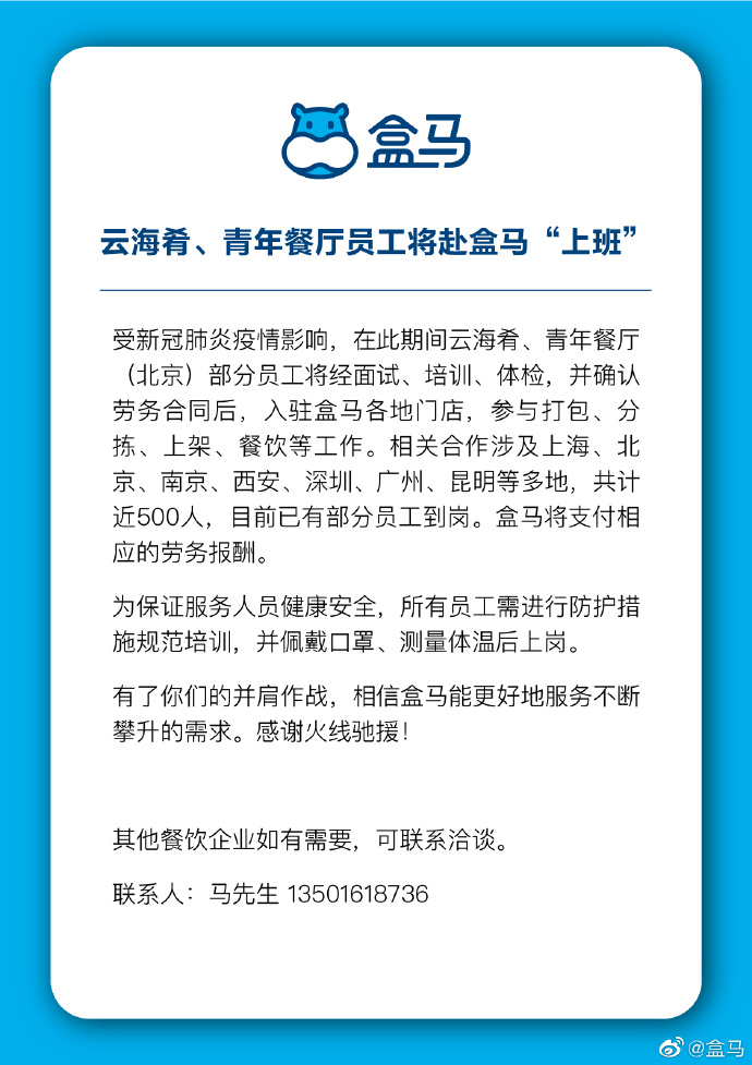 另一边却是盒马鲜生、京东到家、每日优鲜等生鲜平台迎来生鲜配送订单大幅增加,门店员工出现大幅紧缺的忙碌景象。而日前一条云海肴、青年餐厅员工将赴盒马“上班”的消息更是刷爆了朋友圈。目前,57度湘、茶颜悦色、蜀大侠、望湘园等著名餐饮企业已与盒马达成合作,将共计支援盒马500多名员工,西贝餐饮贾国龙也表示将有1000多名上海员工站上盒马的临时岗位。