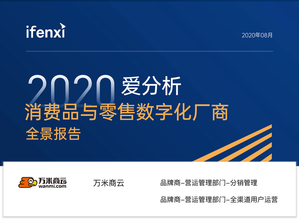 近日,中国领先的产业数字化研究与咨询机构-爱分析正式发布了《2020爱分析·消费品与零售数字化厂商全景报告》,基于对消费品与零售行业品牌商、零售商和数字化厂商的调研,遴选出数字化应用场景中具备成熟解决方案和落地能力的厂商,万米商云入选本次报告中分销管理和全渠道用户运营两大应用场景。