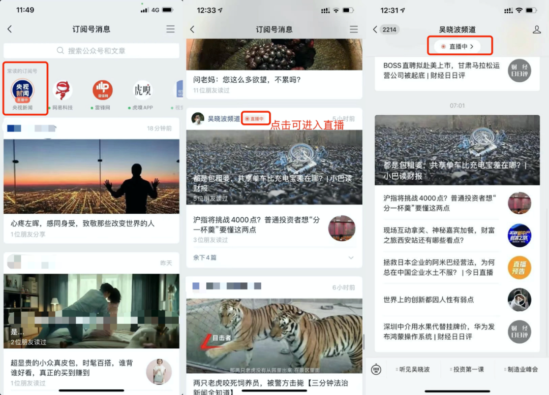 在视频号和公众号绑定的前提下,如果视频号正在直播,其订阅号会显示直播状态,共有三种场景:
