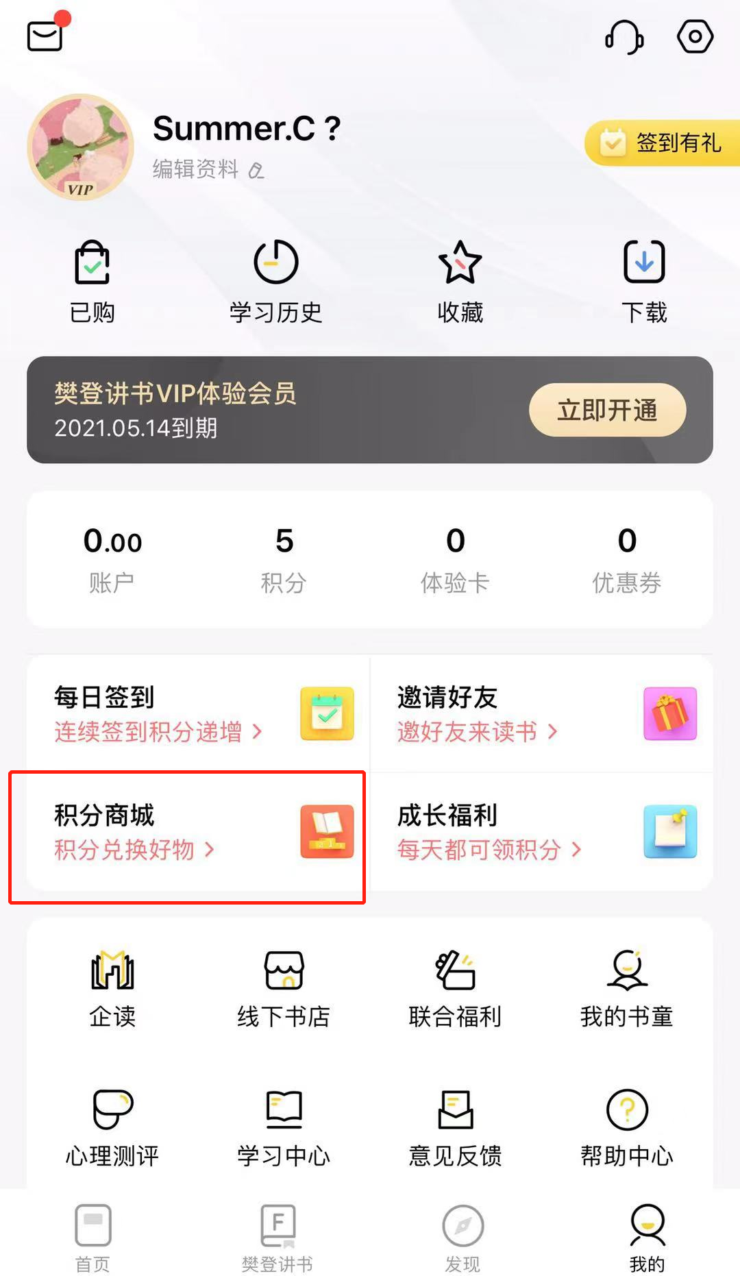樊登读书在社群运营上有自己独有的一套,他们擅长利用线下分销和线上口碑裂变的结合,打开知识付费市场,吸引目标群体,并一次一次用指数型增长的速度,打破人们对社群运营的认知。而心选商城,就是助力樊登读书打开“下沉市场”的有力工具。在樊登读书APP中,心选商城完美嵌入,用户完成新手任务、学习任务、日常任务等,都可获得积分,积分可用于在心选商城中购物抵扣现金,形成了末端实体商品销售及商城用户积分闭环。由此增加用户粘性,培养用户对樊登读书的使用习惯,达到沉淀私域流量的目的。