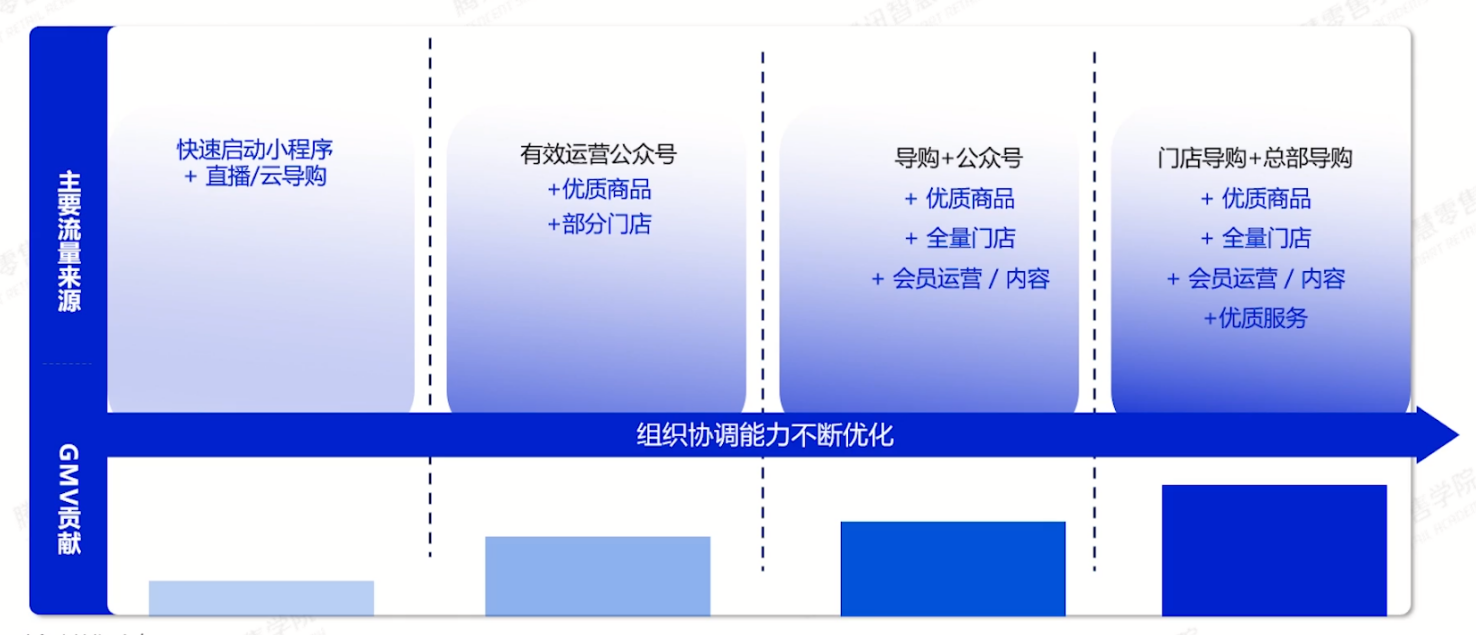 快速搭建小程序,配合直播和云导购,实现初步的导购数字化、客流数字化。需明确小程序在私域业态的定位,全面规划小程序端内的会员运营、品牌营销、社群运营、直播运营等功能。这一过程需要品牌的大力支持,包括跨部门联动,包括和原有IT团队的沟通,开发设计小程序商城,和线下门店沟通,商讨运营策略等等,从而实现品牌线上心智打造。
