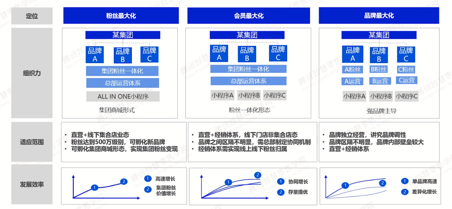 围绕集团化运营,基于不同集团搭建匹配私域运作模式及中台体系,整体可以分为粉丝最大化、会员最大化、品牌最大化三种不同类型。粉丝最大化模式所需集团直营比例较高,集团共有粉丝量级较多,集团下属品牌较多且有孵化新品牌的诉求,此种模式下粉丝体量增长会特别快。会员最大化模式会将集团不同品牌的粉丝交由不同品牌管理,各自品牌各有小程序体系,而整体的运营体系由集团统一制定,各个品牌之间会有竞争关系。品牌最大化由品牌事业部指挥各个品牌各自奔跑,讲究各品牌独立运营,强品牌主导,品牌内部壁垒较大,是目前最常见的集团化模式。