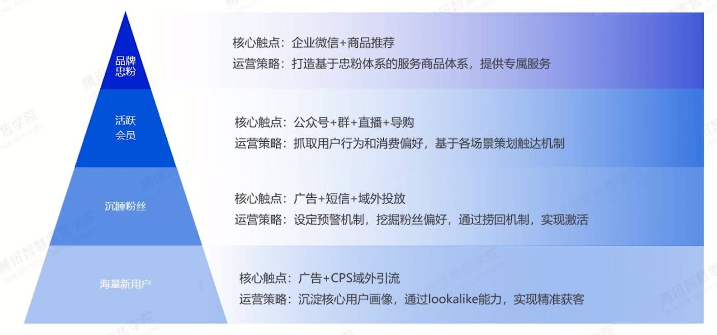 围绕粉丝运营,完善私域粉丝精细化运营模型,通过对需要触达的人群分层:品牌忠粉、活跃会员、沉睡粉丝、海量新用户,匹配相应的平台工具和运营策略。