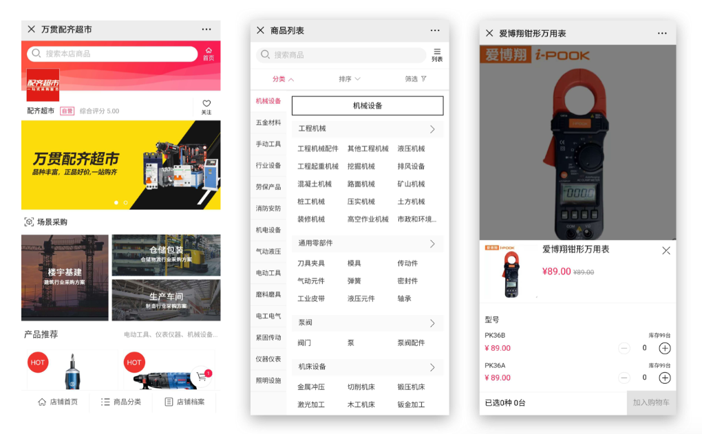 对商家而言,万贯汇既是线上营销平台,帮助商家解决线下地域限制、客流下降、档口成本升高等痛点,又是商品展示平台,帮助商家快速实现品牌传播。对采购商而言,万贯汇平台整合市场各商家,拥有全面多样的产品组合,为采购商提供机电设备、仪器仪表、电工电气等齐全优质的五金机电产品。前端提供微商城+小程序的采购终端,采购商既可及时获取商家促销信息,又可实现随时随地一站式采购。