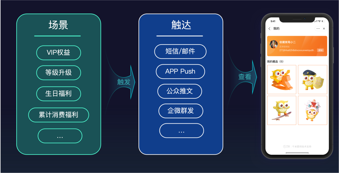 1、支持将数字藏品与会员体系运营结合,在各类用户运营场景中发放数字藏品权益、传播品牌理念。例如在品牌会员日、VIP权益、会员生日礼、积分兑换、购物回馈等场景中发放珍稀数字藏品,可增强用户体验、提升会员忠诚度;