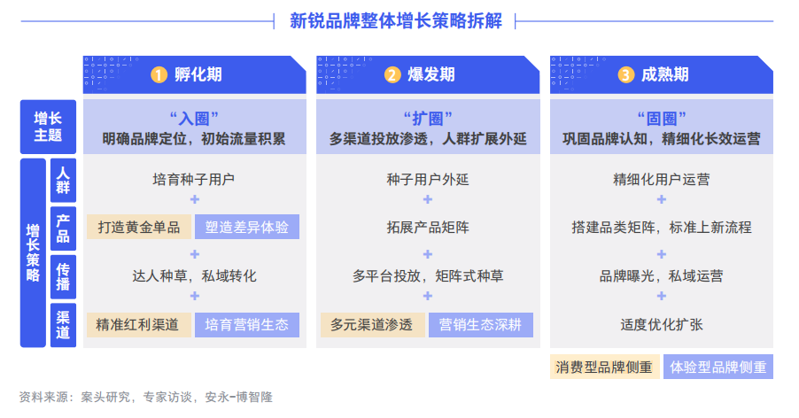 而新锐品牌通常经历孵化期、爆发期、成熟期三个发展阶段,分别以入圈、扩圈、固圈为增长主题,这也是品牌私域搭建、增长、完善的一个过程。