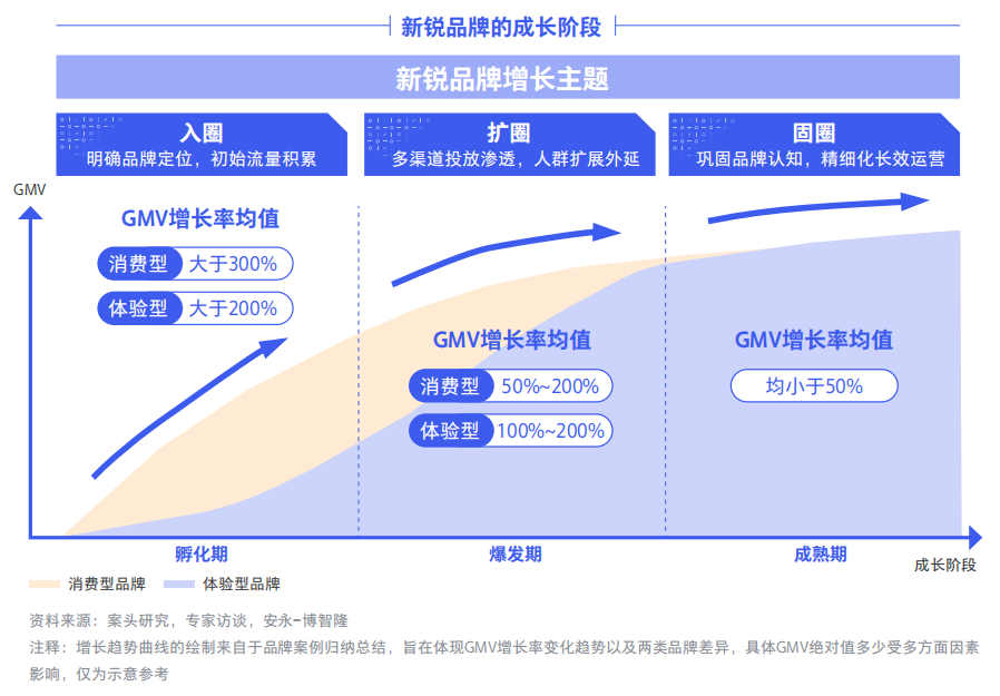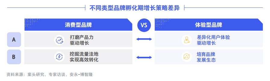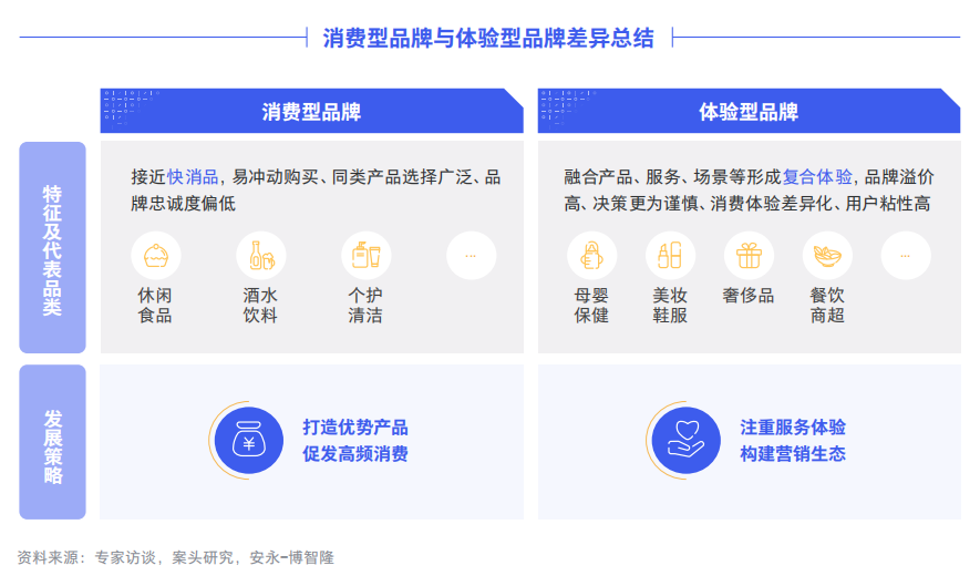 根据自身的特征属性及消费者的行为习惯,新锐品牌分为消费型品牌与体验型品牌两大类别,两者在品牌发展策略上有所差异。