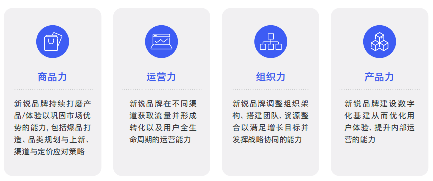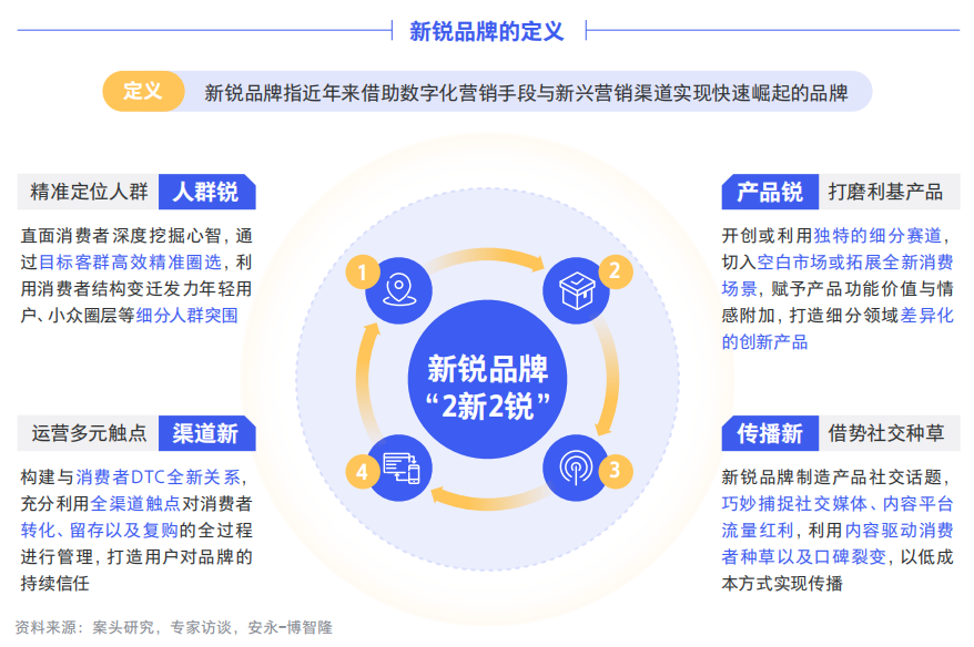 新锐品牌具备“两新两锐”的特征,即人群锐、产品锐、传播新、渠道新,在品牌发展的各个阶段中不断迭代优化,从而驱动品牌实现增长突破。