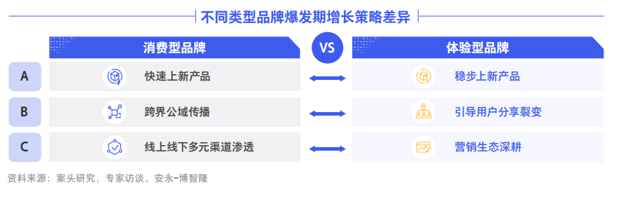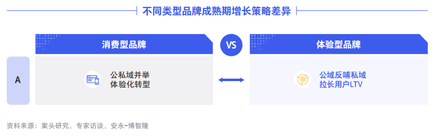 当然,当品牌发展趋于成熟后,两类品牌的部分策略逐渐靠拢,如很多成功的消费型品牌开始涉及客户关系的私域运营,而体验型品牌则尝试布局大型媒介投放。