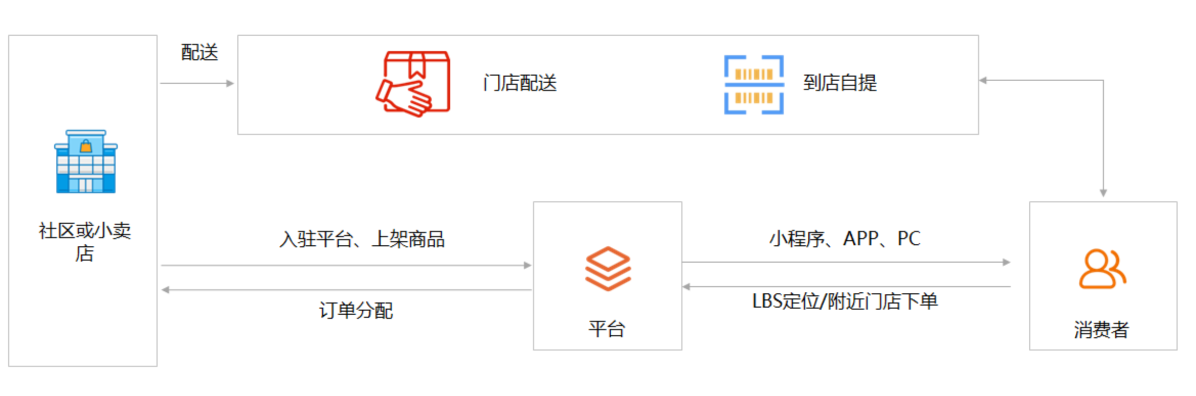 社区或小卖店以独立店铺方式入驻平台,独立店铺露出,消费者根据LBS定位匹配到最近门店商城,通过线上下单,平台将订单分配给对应门店,由线下门店进行配送或者消费者到店自提。