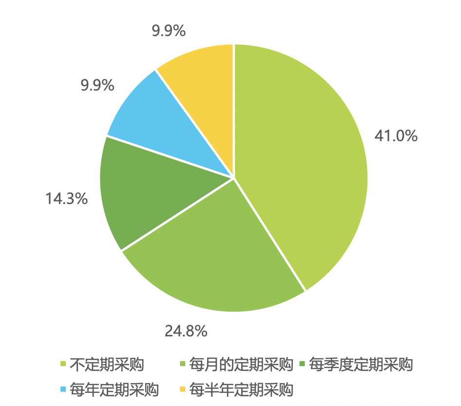 当前,企业采购周期随机性强,采购频率高。有41%的企业,一般采用不定期采购的方式,约有25%的企业采用每月定期采购的方式。此外,多数企业的采购渠道,仍然依赖采购经理独立挖掘,或者行业内供应商相互推荐。