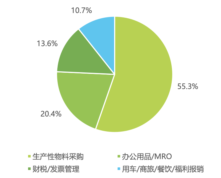 当前,超过50%的企业,主要将数字化采购管理产品,应用在生产性物料采购领域,尤其是传统行业、零售业、科技行业, 占比均接近60%。此外,在涉及企业费用支出的不同环节,企业也不同程度地引入数字化采购产品。由此可见,数字化采购管理产品正逐步渗透进企业费用支出的全流程,能提供更全面管理功能的数字化采购产品是行业的普遍需求。