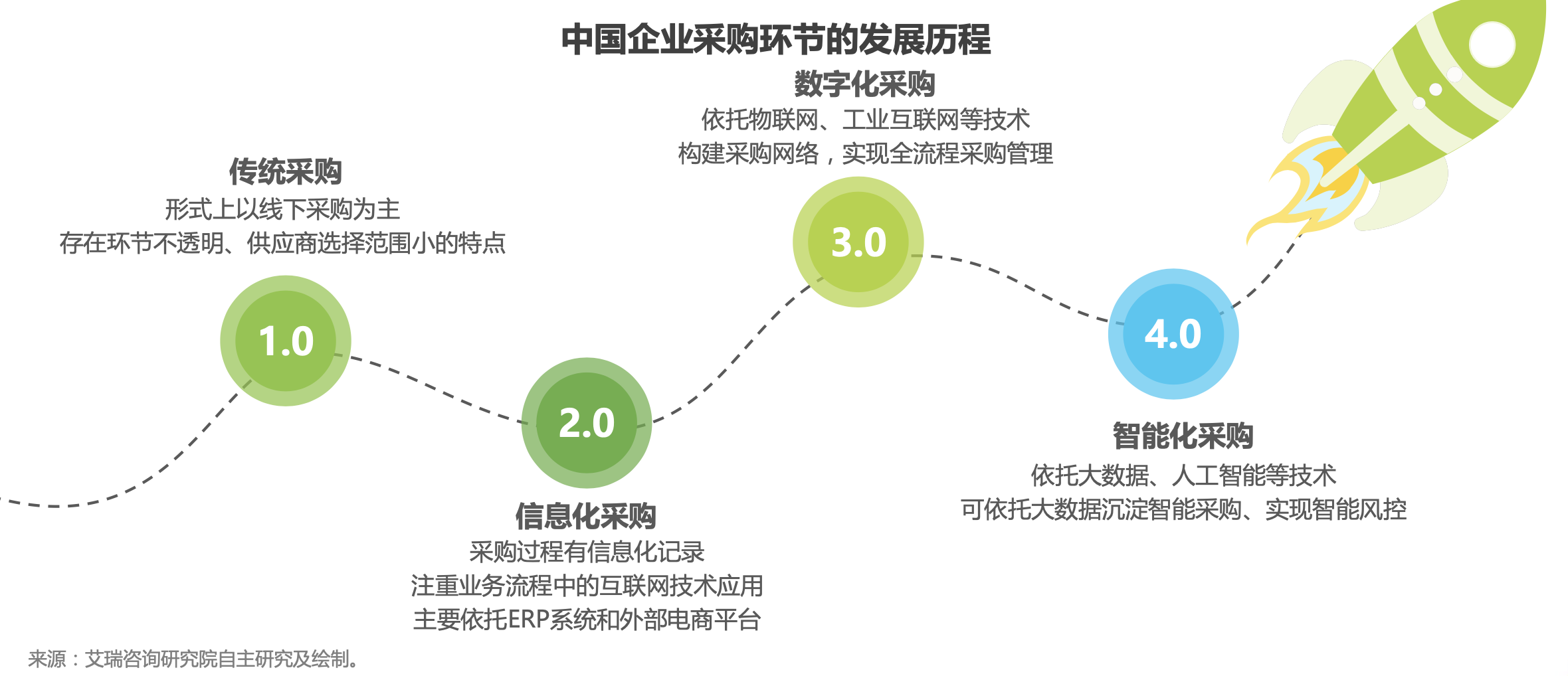企业采购包括了需求搜集、采买以及投入使用的全过程。由于采购环节在企业降本增效的实践中意义重大,所以采购业务的数字化升级也被逐步重视。我们将采购的发展历程分为四个阶段,最早期是以完全的线下采购为主,范围局限在企业所在城市地区。第二阶段是信息化采购,应用计算机对业务信息进行留存。第三阶段是数字化采购,得益于产业互联网的发展和基础信息建设的进步,所涵盖的内容也扩展为从供给端的寻源、匹配、采购,管理和需求端的需求统计、上报、采购、分发全链条的泛采购概念。第四阶段,采购业务将在充分数字化的基础上实现智能化,构建采购生态。