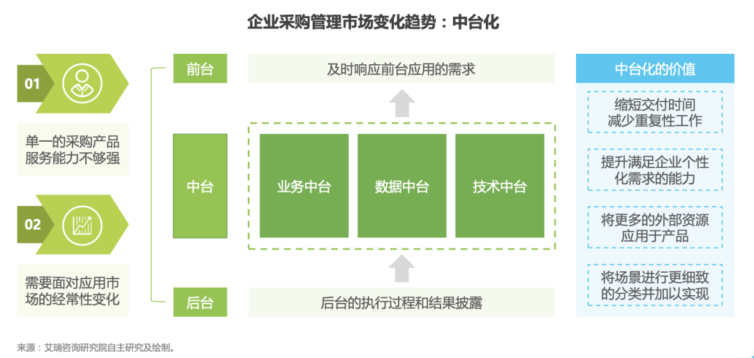 随着企业采购业务对数字化需求的不断增加,增强中台能力将成为采购管理厂商的发展方向。采购中台通常可分为业务中台、数据中台和技术中台三部分,技术中台用于对接外部需求,数据中台用于分析业务数据,业务中台用于快速响应前台需求。中台能力的增强能够帮助企业进一步降本增效,助力企业数字化转型中的技术应用升级,技术与业务管理进一步融 合,以及组织重构。