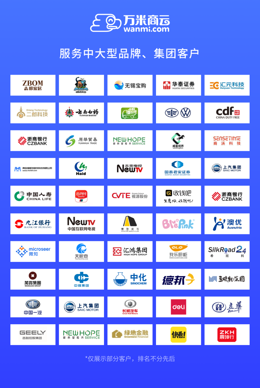 万米商云服务了多家大型企业的数字化采购、员工福利内购等项目,接入京东VOP、LinkedMall、东方团购中心等供应链渠道资源,提供通联支付和支付分账解决方案,解决企业交易、分账痛点,为更多企业客户提供从供应链、IT到运营等一系列的解决方案。