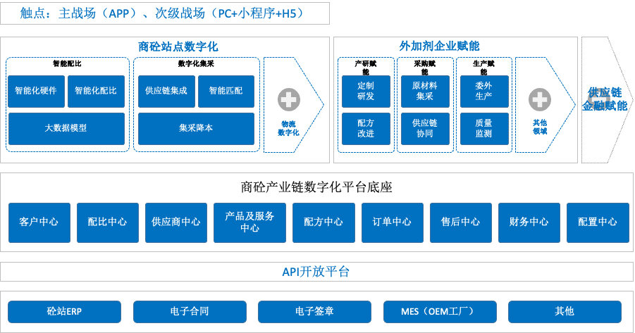 商砼产业链数字化底座将构建包括客户中心、智能配比中心、供应商中心、产品及服务中心、配方中心、订单中心、售后中心、财务中心、配置中心能力作为支撑系统。通过构建开放的API平台与内外部的系统进行互联互通,提升异构系统的集成效率。
