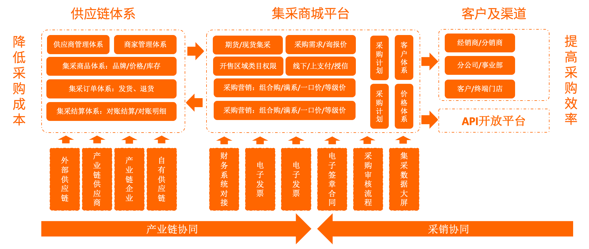 通过组合内外部供应链、供应商系统资源;构建企业数字化供应链体系,提升供应链能力;通过数字化集采商城提高下游采购效率和降低采购成本;支持对外提供供应链服务。