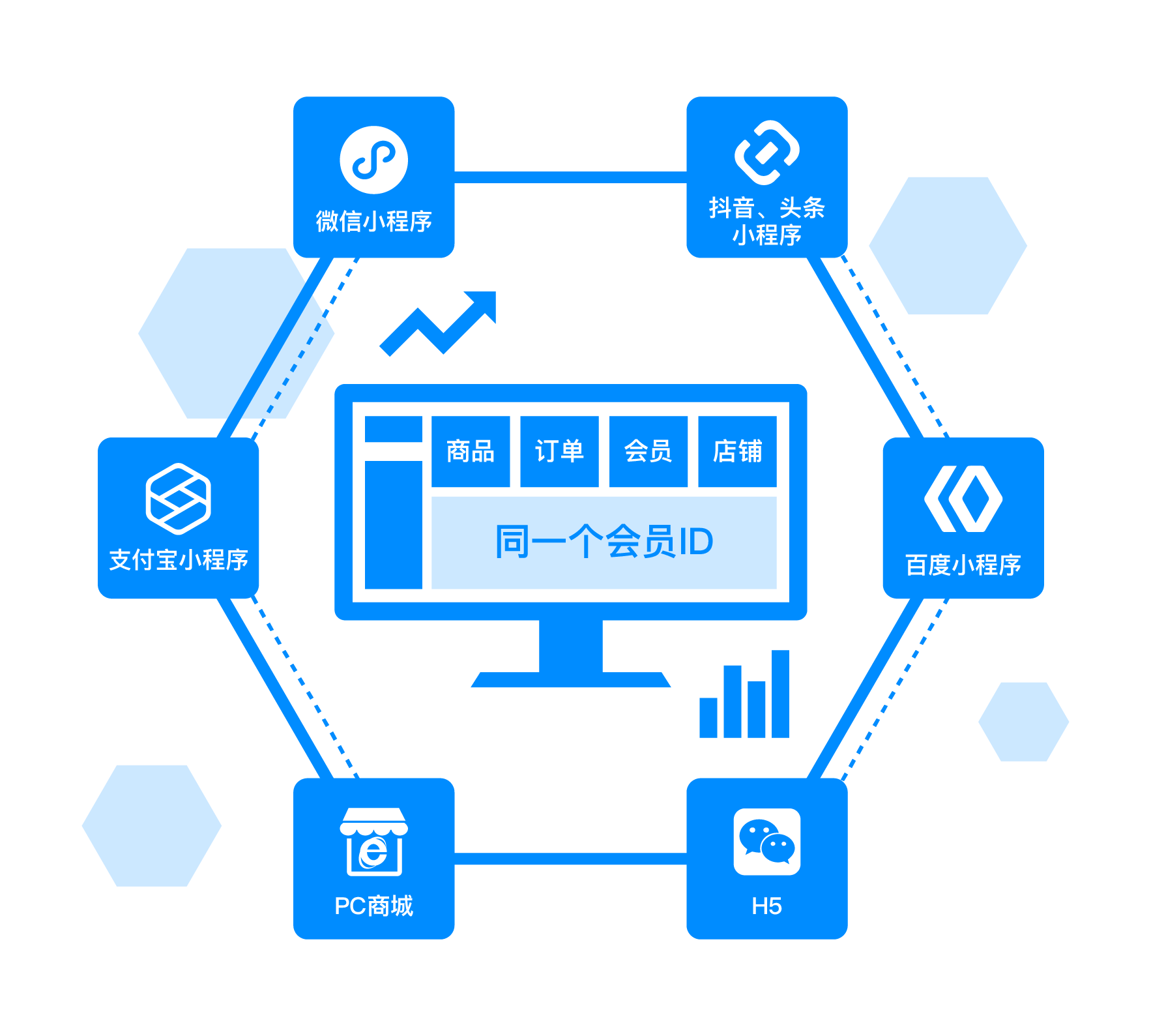 多端客户同一个会员ID,客户无需注册多个账号,数据不重复,客户也不麻烦,商家轻松实现一站式运营。