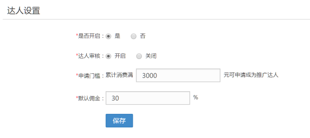 1、开启并配置推广达人,可根据消费金额设置达人的门槛,并提前设置好推广商品成交后达人可以获得的佣金。
