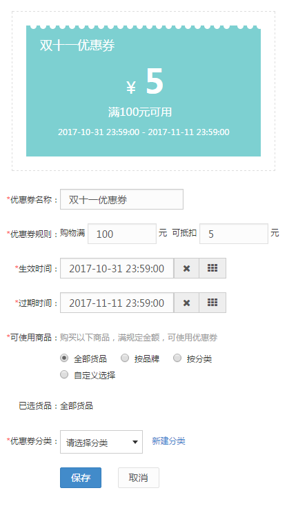 优惠券可在后台设置添加,顾客领取优惠券后在购物时支付时可以调取自动抵扣。